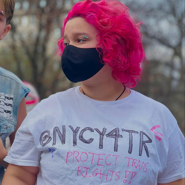 Before coming out, and more frequently after I came out, I noticed an up-charge of anti queer and trans laws being passed, resulting in the murders and suicides of trans people. People just like me, who had the same experiences I have. When we first started NYC Youth for Trans Rights, I simply wanted to be loud and make sure people know that we're here, we're queer, and we're not going anywhere. But as time went on, I realized it's about more than that. This is about the people I'm marching with as well. It's about letting them all know that they're not alone, that they're loved, and that we won't be erased